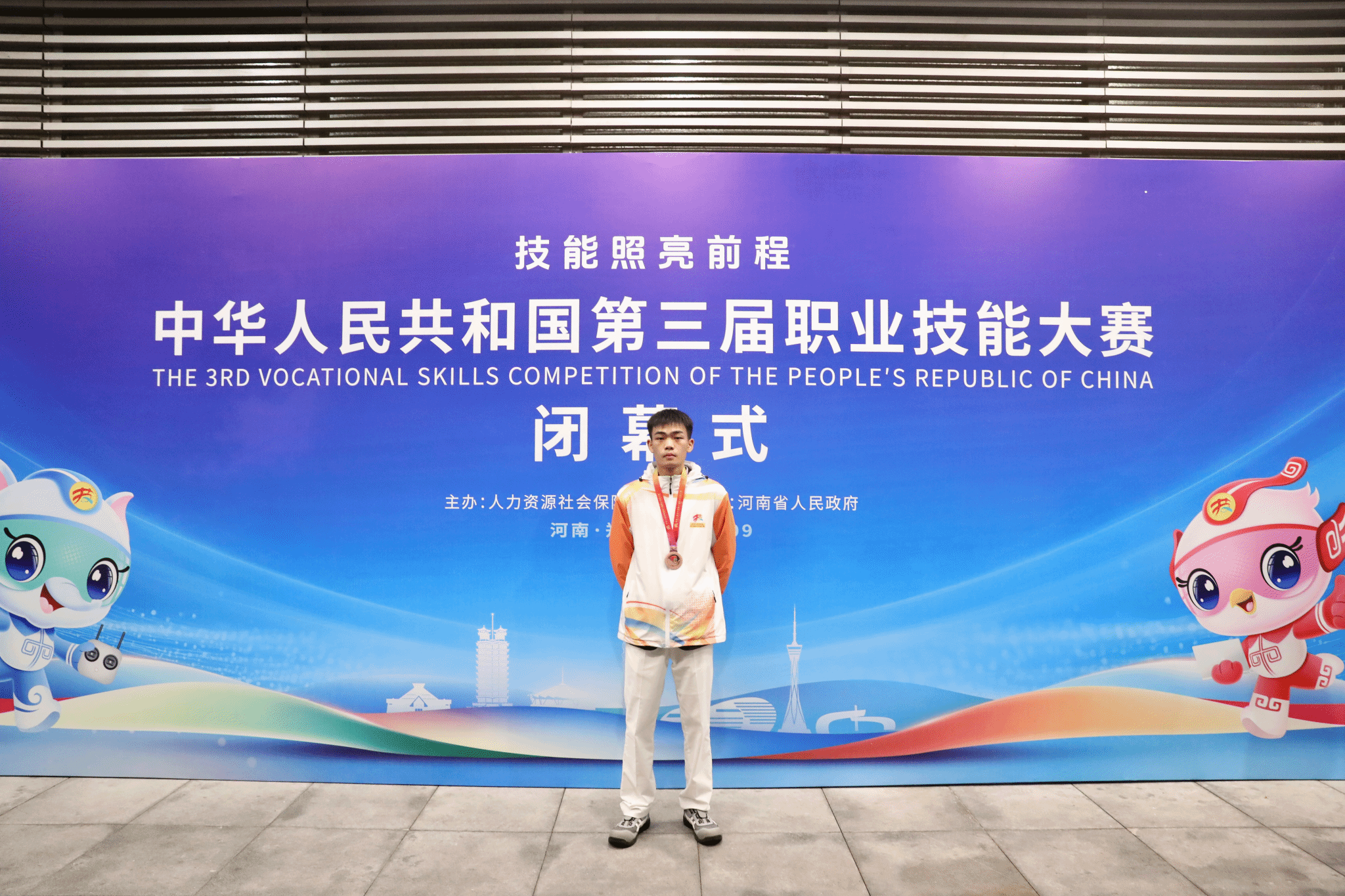 9月23日,中华人民共和国第三届职业技能大赛圆满落幕。在这场代表国内技能竞技最高水平的巅峰对决中,我院参赛选手以昂扬的斗志、精湛的技艺和卓越的工匠风范,在为期三天的激烈角逐中脱颖而出,勇夺1金2银1铜,以耀眼战绩刷新了学院参赛史上的辉煌纪录。成绩的背后,是学院坚持技能育人、匠心育才的坚定信念,是教练团队科学施训的智慧汗水,是选手们对专业技能的极致追求和顽强意志,更是全院上下协同育人、倾力保障的集体荣光。今天,让我们一起走近铜牌选手刘培原,倾听他的故事……