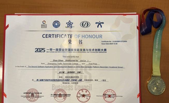 近日,2025年“一带一路”暨金砖国家技能发展与技术创新大赛第二届基于信创平台软件应用与开发赛项全国总决赛圆满落幕。郑州交通技师学院荣获大赛最佳组织奖,学院汽车技术系赵子豪同学荣获中职组一等奖(金牌),李杭聪同学获得中职组优秀奖,系主任刘璐获优秀指导教师。