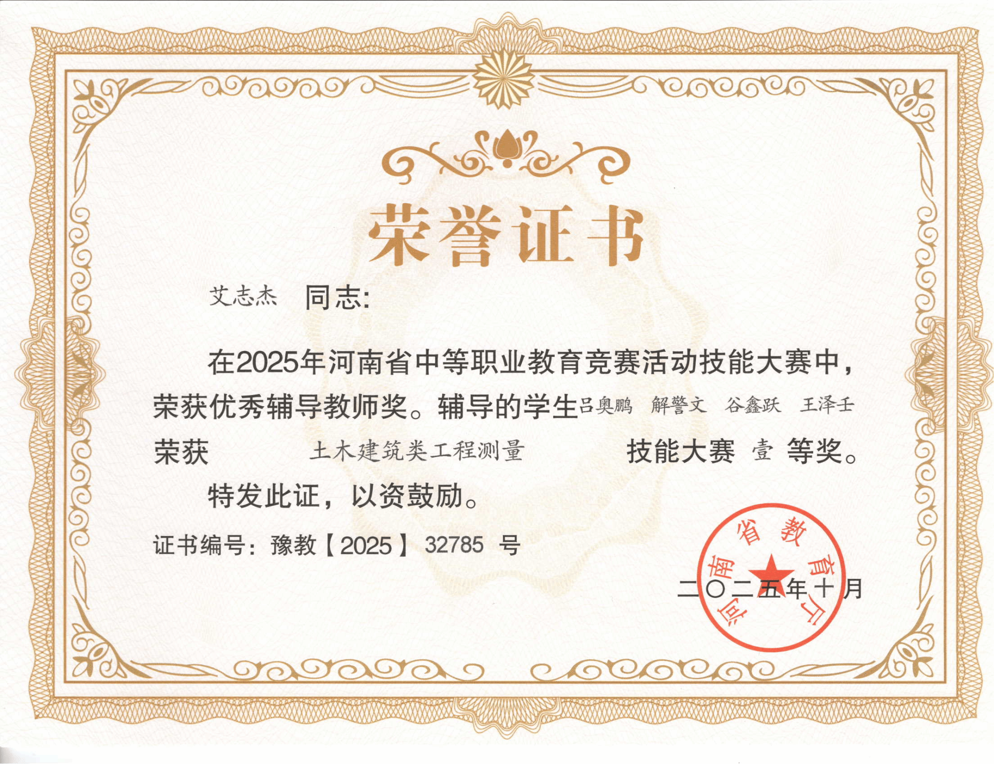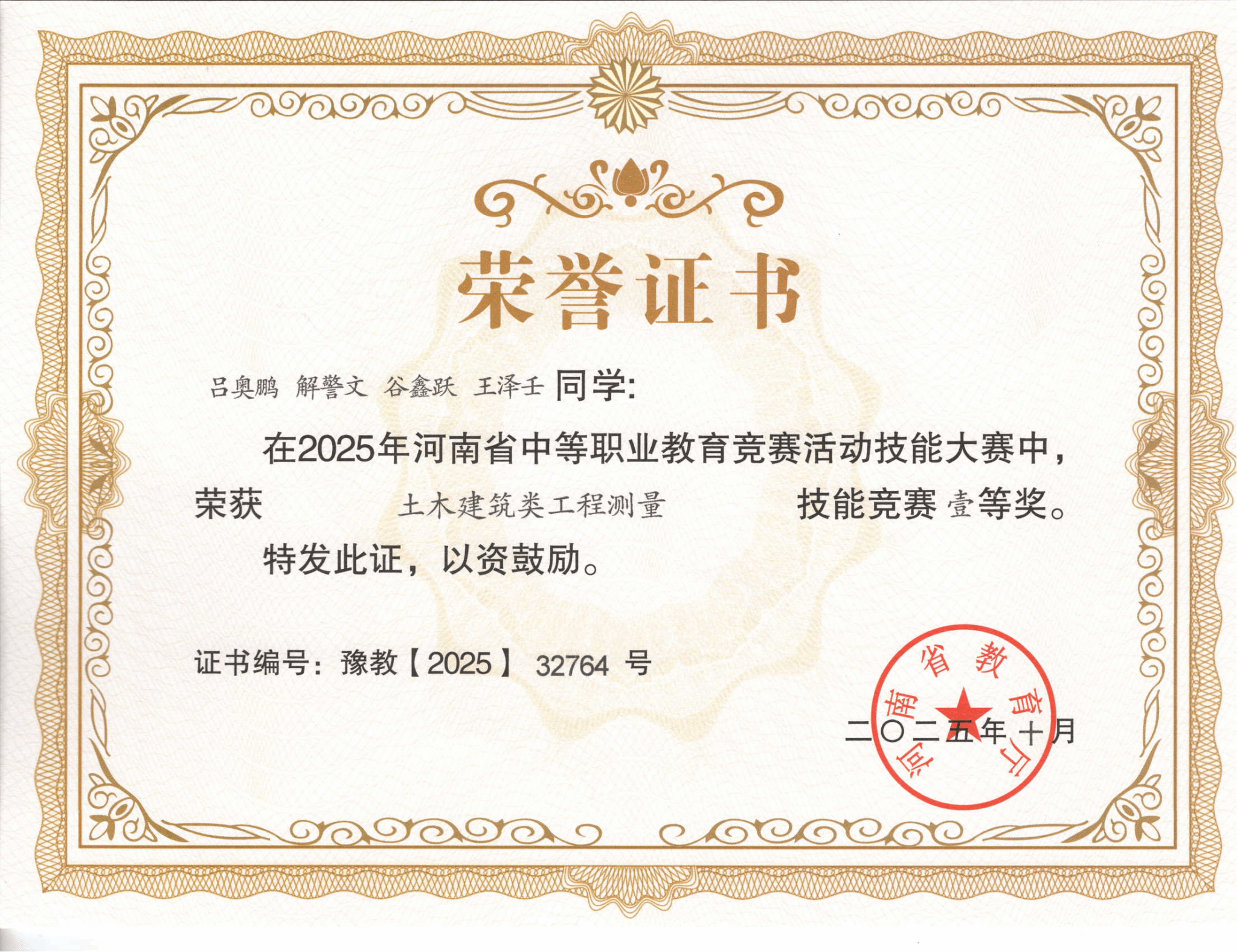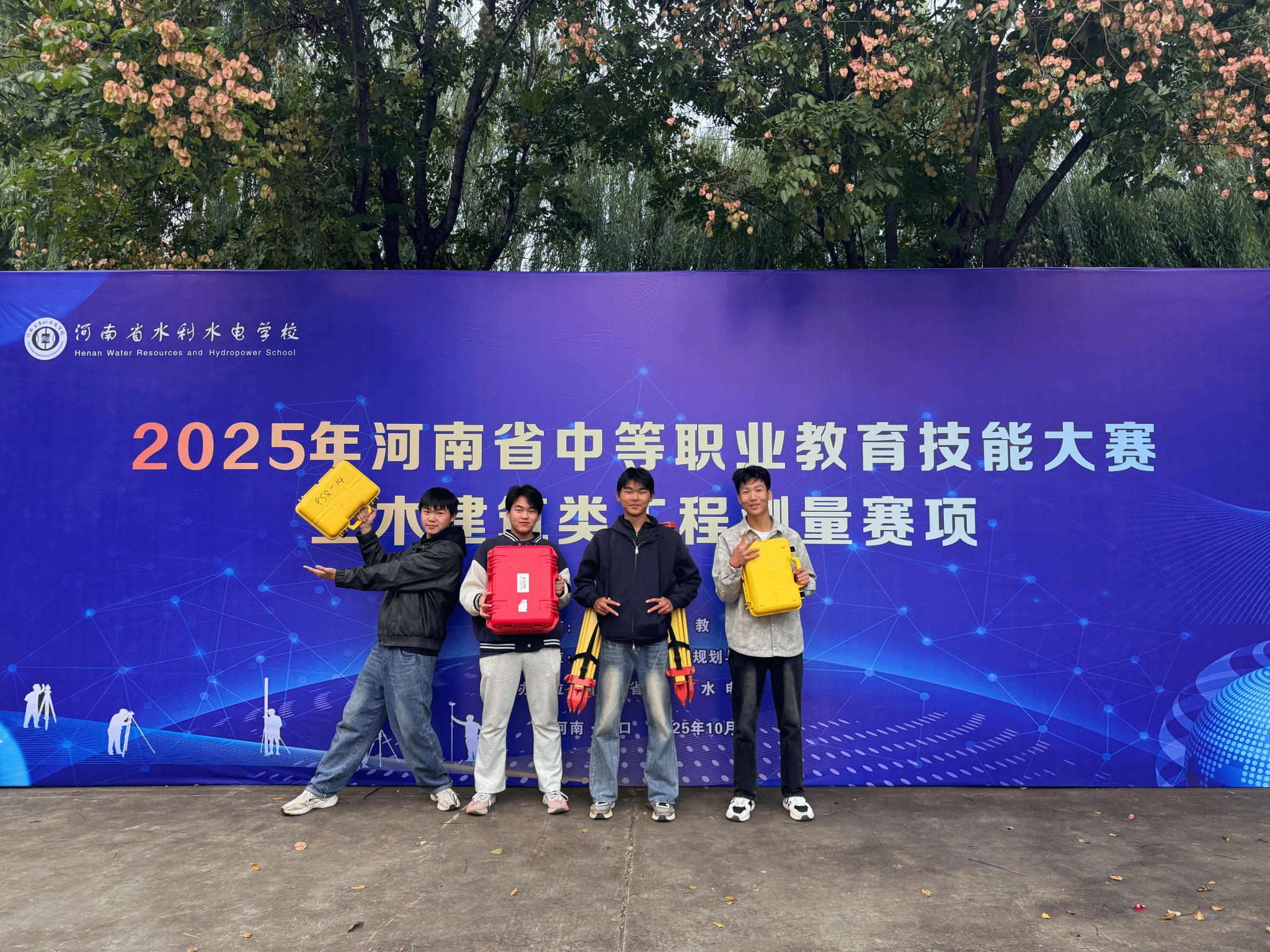金秋送爽,捷报频传!10月19日,在由河南省教育厅主办的2025年河南省中等职业教育技能大赛土木建筑类工程测量赛项中,我院交通工程系学生王泽壬、吕奥鹏、解警文、谷鑫跃组成的代表队荣获该赛项一等奖。