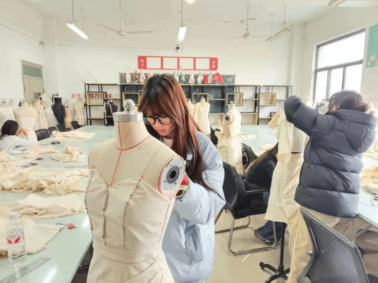 竞赛现场,同学们或伏案勾勒设计蓝图,或在制版桌前精准规划版型,或操控缝纫机细致缝制面料,或于人台旁精调立裁造型,将创意构想转化为兼具美感与工艺的时装作品。