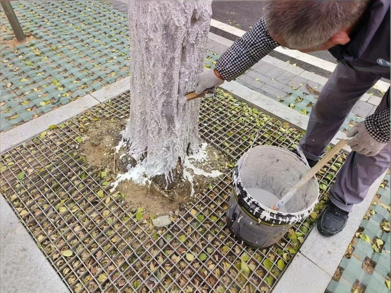 近日,随着气温持续走低,为保障植被顺利过冬,学院后勤处工作人员全面启动了冬季树木刷白养护工作。