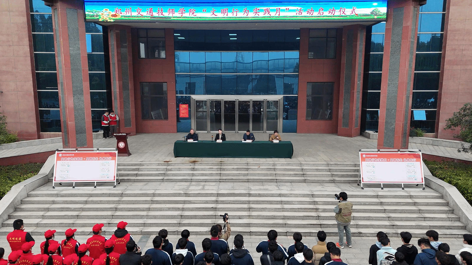学院党委书记、院长陈振华首先分享了学院在技能竞赛中取得的喜人成绩:在第三届全国技能大赛中,我院选手王盛研、霍言博、李晨硕、刘培原代表河南斩获1金2银1铜,实现金牌领域“从无到有”的关键突破以及参赛选手100%登榜夺牌的骄人佳绩,以“双突破”书写了学院技能竞技全新历史。她向获奖选手及指导教师表示祝贺和感谢,并指出,“技能是立身之本,文明是立德之基”,二者共同构筑起高素质技能人才的坚实基础。围绕“文明在心 礼貌在行”的活动主题,陈书记对全体师生提出三点期望:一是内化于心。希望师生从一句问候、一次礼让做起,将礼貌待人、尊重师长、爱护公物内化为日常自觉,让文明成为内心深处的修养;二是外化于行。鼓励大家积极投身志愿服务、文明劝导等实践活动,在亲身体验中感悟文明的力量,收获奉献的快乐;三是持之以恒。学院将建立长效机制,将每学期第一个月固定为“文明行为实践月”,推动文明行为常态化、长效化。最后,陈书记郑重宣布:“郑州交通技师学院‘文明行为实践月’活动正式启动!”