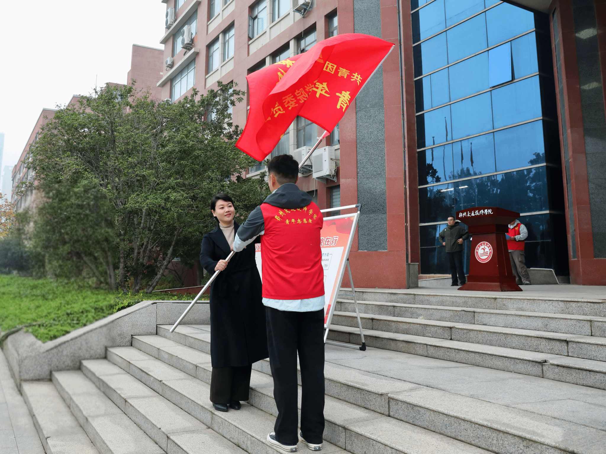 学院团委负责人王喆灏向全体师生发出文明倡议。学生志愿者代表王浩权发言,表达了从我做起,投身文明实践的决心。学院党委书记、院长陈振华向青年志愿者服务队授旗,一段新的文明实践征程正式开启。